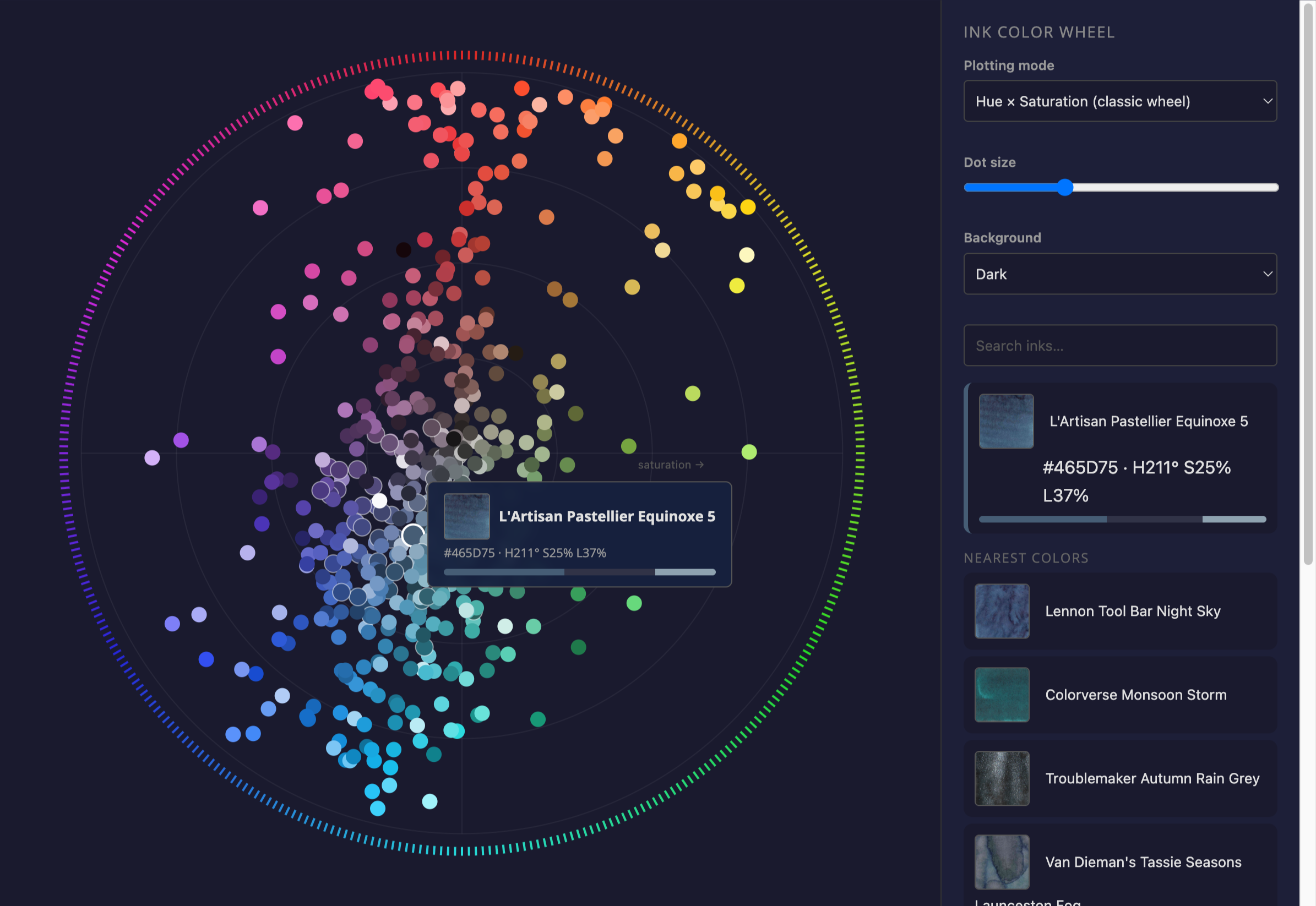 It maps my ever-growing collection of hundreds of different inks into a searchable, interactive space. You can toggle between plotting them by Hue and Saturation (the classic wheel view) or Hue and Lightness.